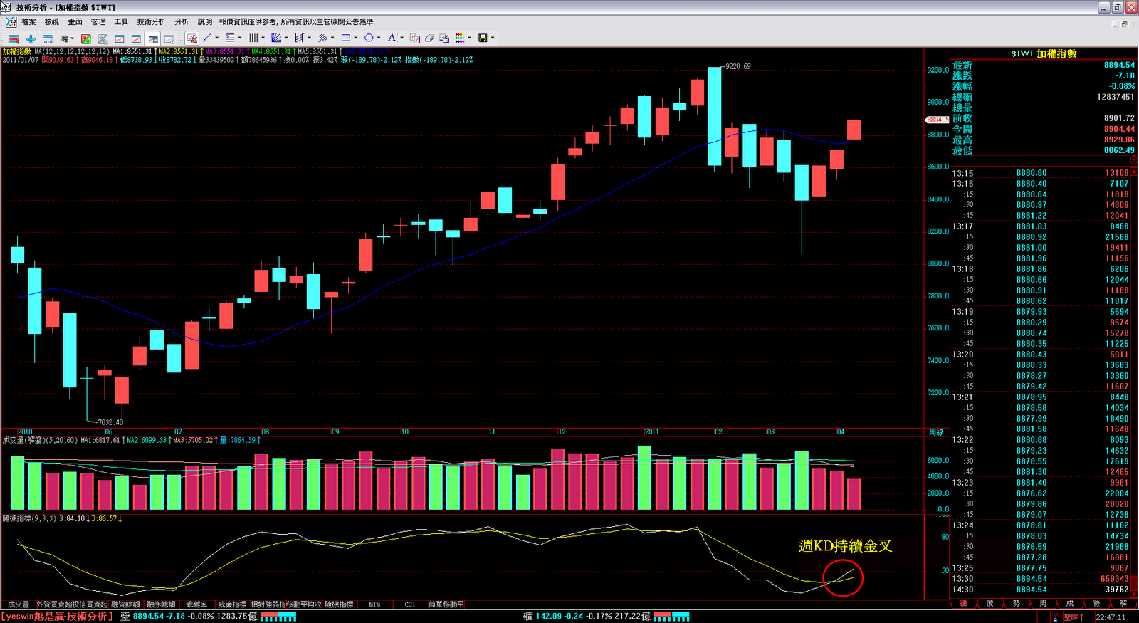 KD金叉,月線重回多方驅勢,而融資又減少看起來是會衝上去 然而外資多單減碼、再加上本月台指期巳漲了600點,再上漲的機會不大,所以未來一到二週,盤勢多偏振盪?