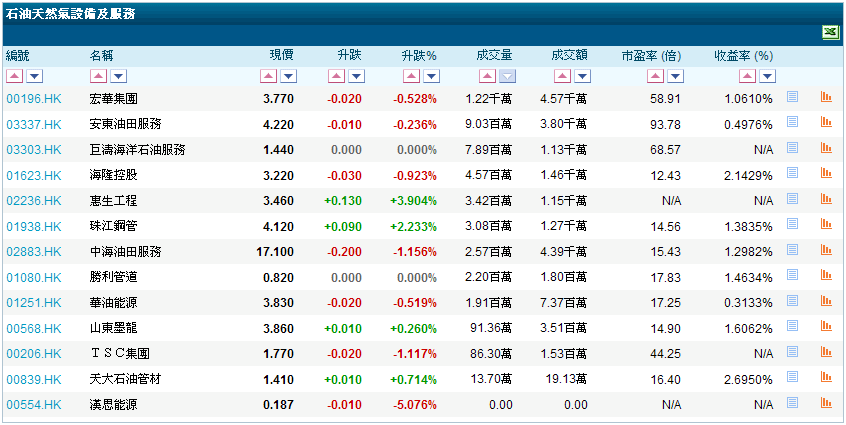 我們從港股的石油天然氣設備與服務分類表中可以看到