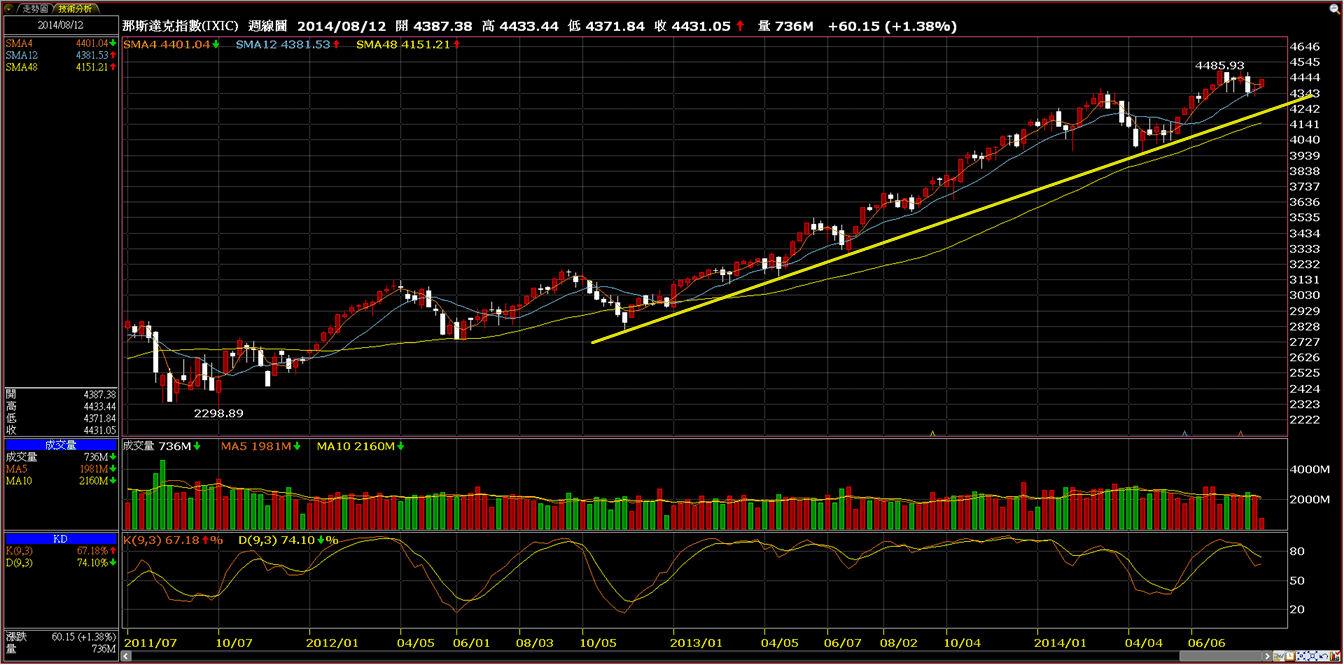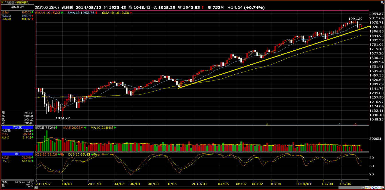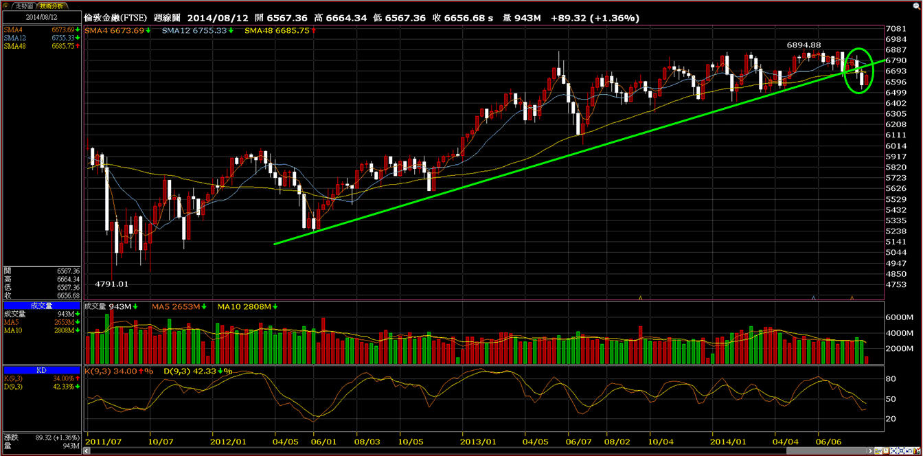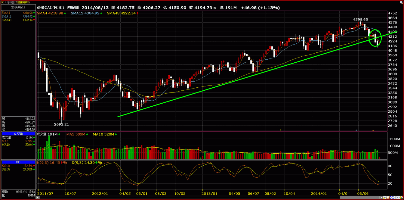 歐股的週K線我一樣劃上上升趨勢線