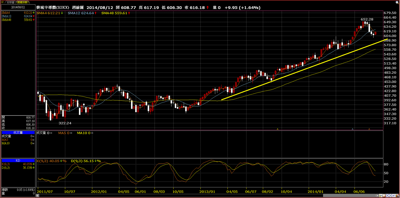 除了那斯達克指數和費城半導體指數還沒有跌破上升趨勢線之外