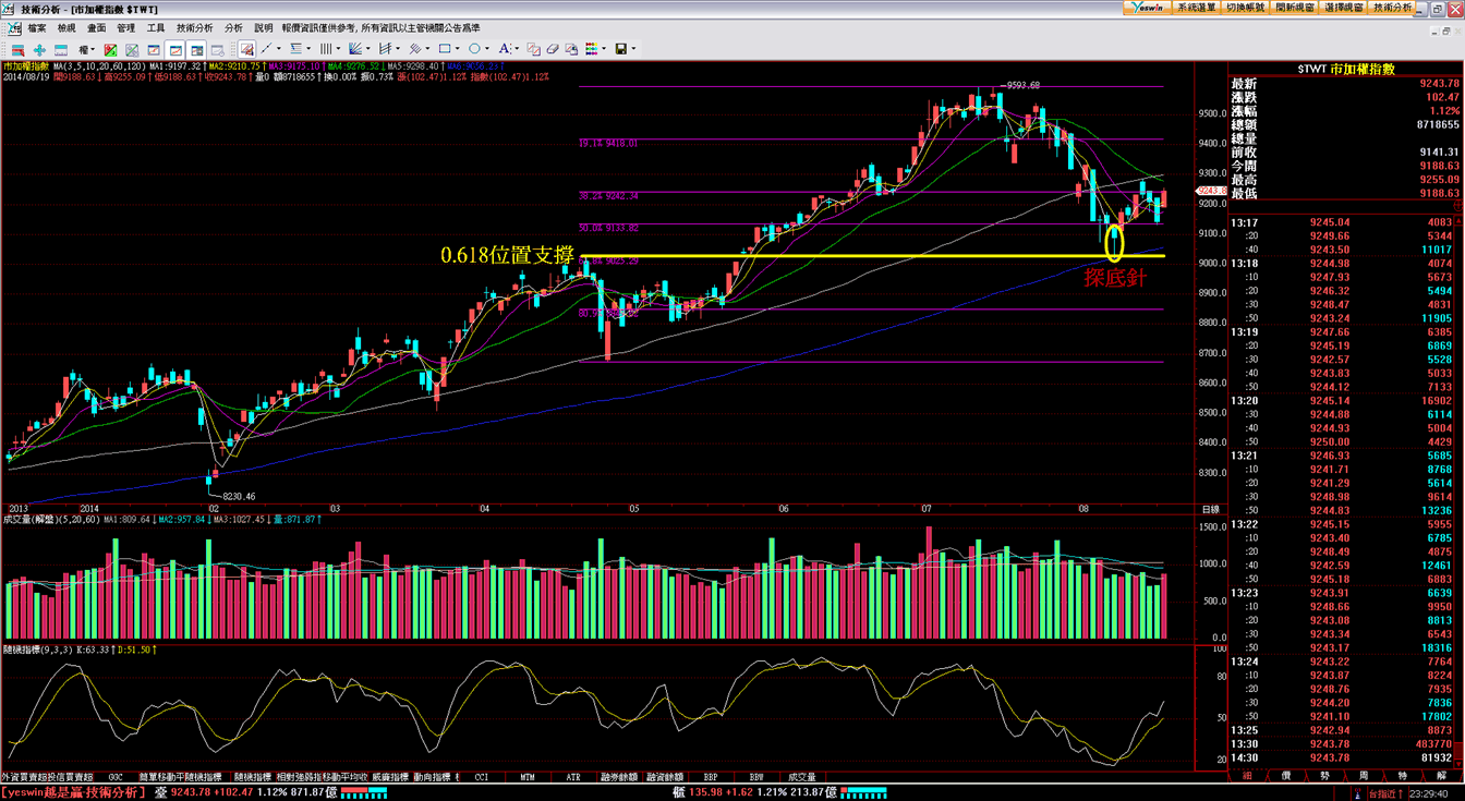 接近9000點的這個位置剛好也是從4月底的小波段最低8671點一路漲到7月中波段高點9593點的波段回檔0.618的技術性黃金切割率的支撐位置