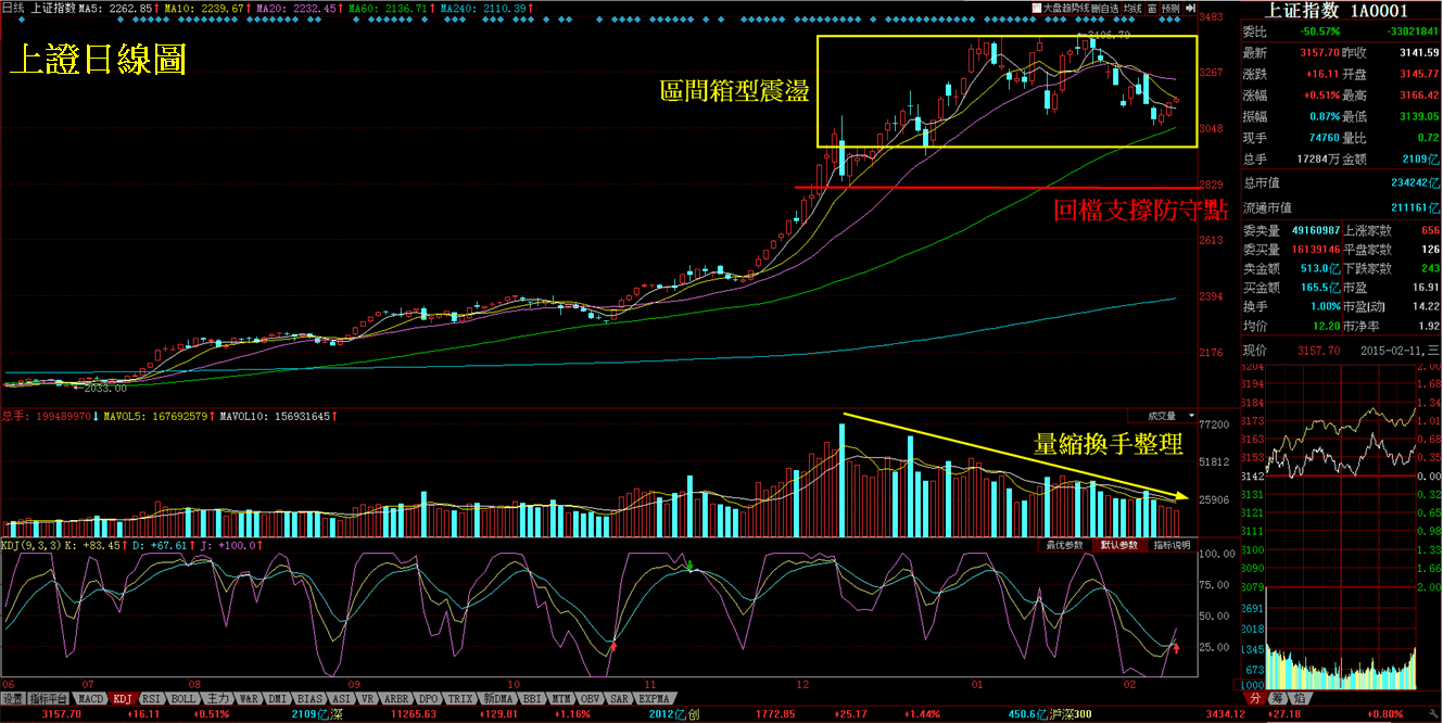 2015/2/11上證指數上漲16點,幅度0.51%成交量則因為回檔行情持續量縮中