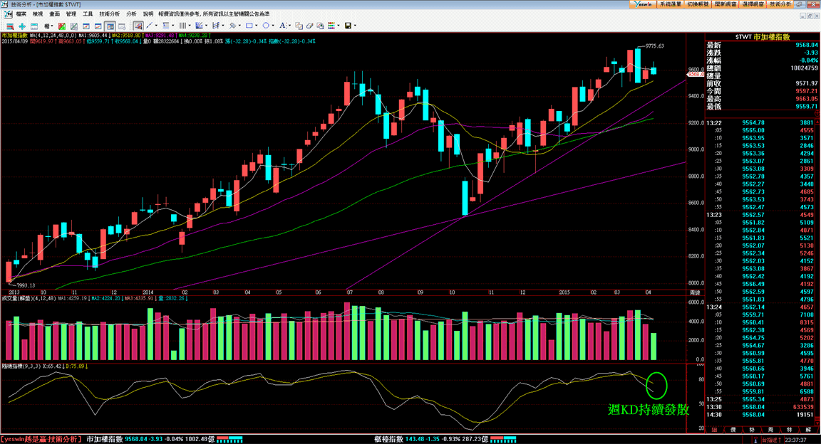 感謝E大提醒 據4/1收盤後的觀察,四月份如果期貨跌破9500的話,月KD也會變成死亡交叉 不知道多頭是否能撐過下週的結算