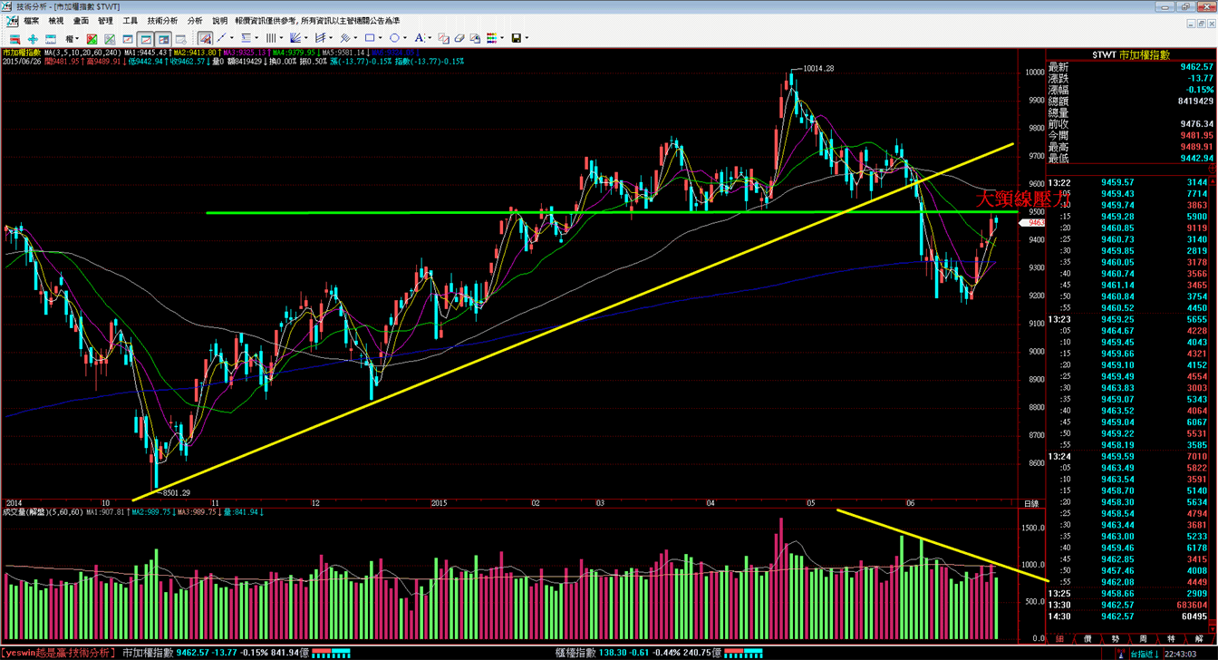 9500點目前已經成為空頭型態中破線的大頸線位置