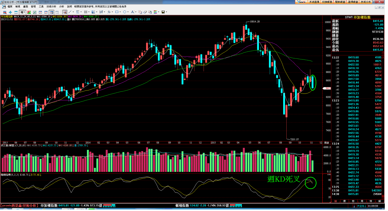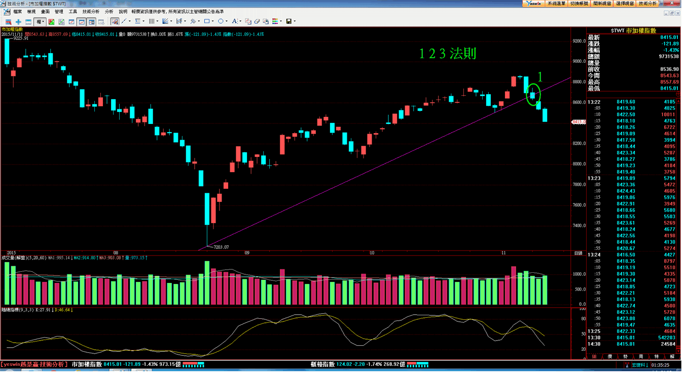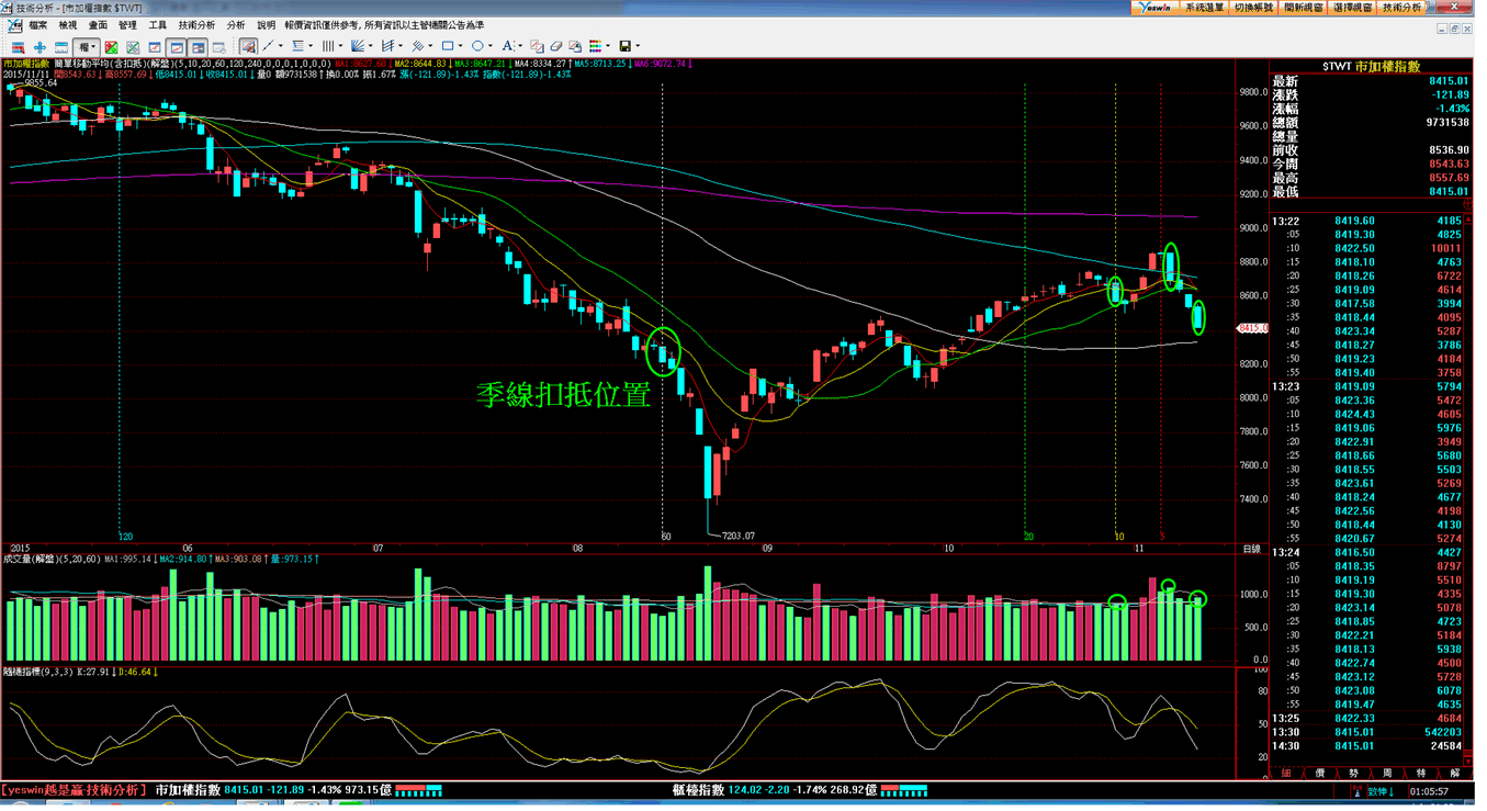台股指數從11/5的8871點短波段高點出現後就一路反轉回跌至今天的低點8415點