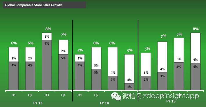消費者到星巴克感受到一個好的氛圍,一杯普通咖啡也不過十幾元,花費不多,卻能得到優質的享受。也是這種對於用戶需求的理解,讓星巴克成為了全球最成功的連鎖餐飲公司。公司于90年代初上市,並且從1994--2007年保持了7%的同店增長和33%的利潤複合增速。同時面臨的競爭對手非常少。