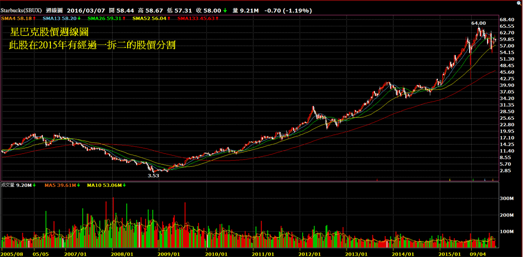 今天我們講述十倍股故事系列的第三篇,星巴克。作為許多陸家嘴金融白領們每天的“標配”,大白馬星巴克通過轉型和高科技,也讓投資者從2009年到2015年底的五年多時間內,賺取了15倍的收益。作為一個白馬股,這已經是非常不錯的回報了。下圖是星巴克的股價走勢圖: