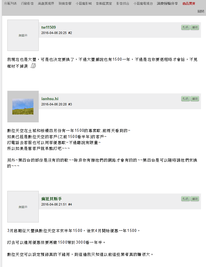 老家在板橋,大豐的畫質,一直以來就是升級的比較慢,所以身邊很多case都早早就換系統了(是說也有朋友換到大豐就是),殺價競爭真的是目前第4台的狀況,幾個月前想空他,但發現都無券可空。不過我也發現大豐電的大股東持股比率越來越高,似乎還很有信心?!