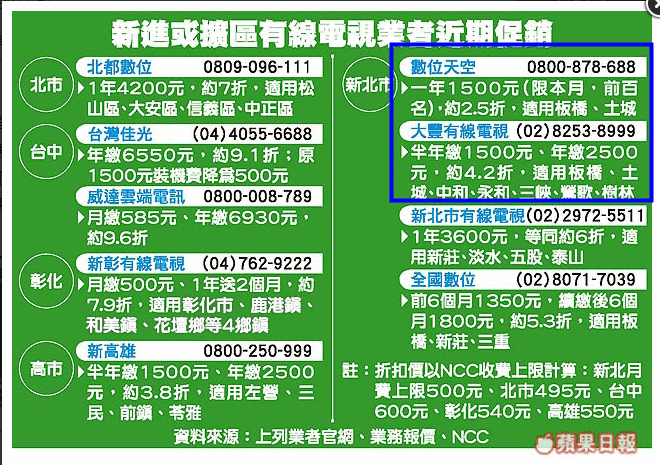 新進和跨區經營業者包括大豐、全國數位、數位天空和新北市有線電視共4家