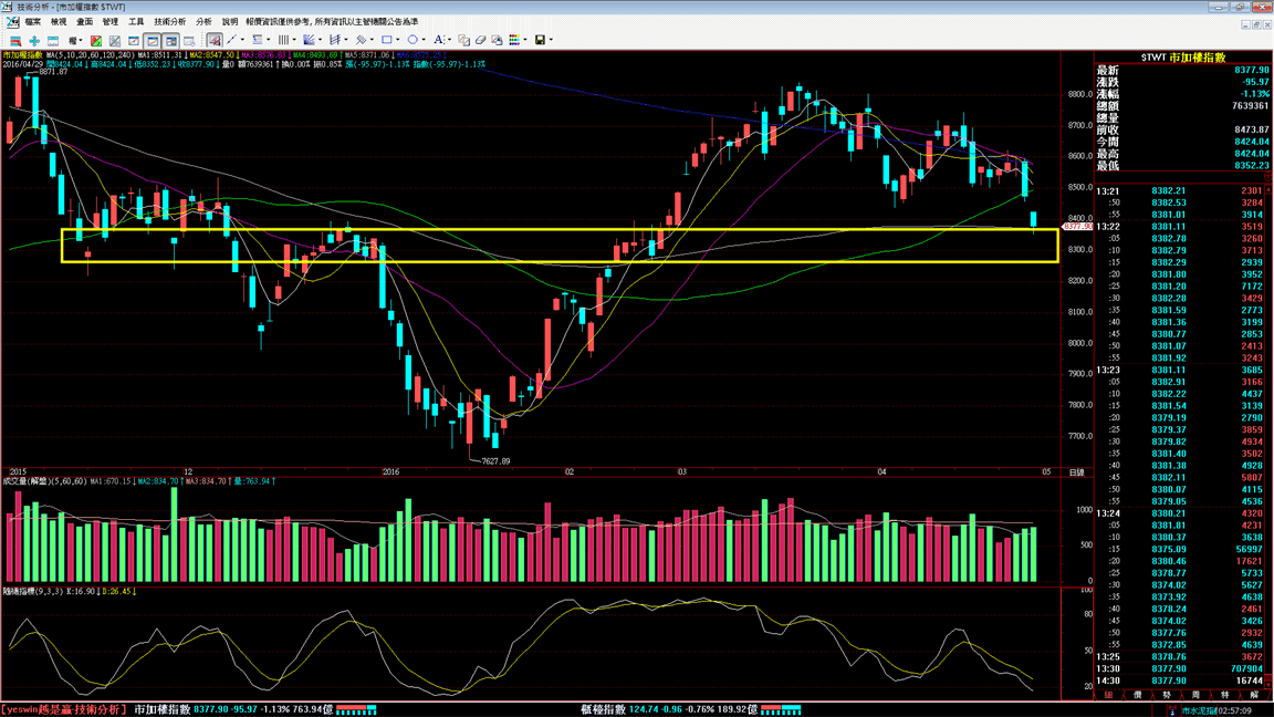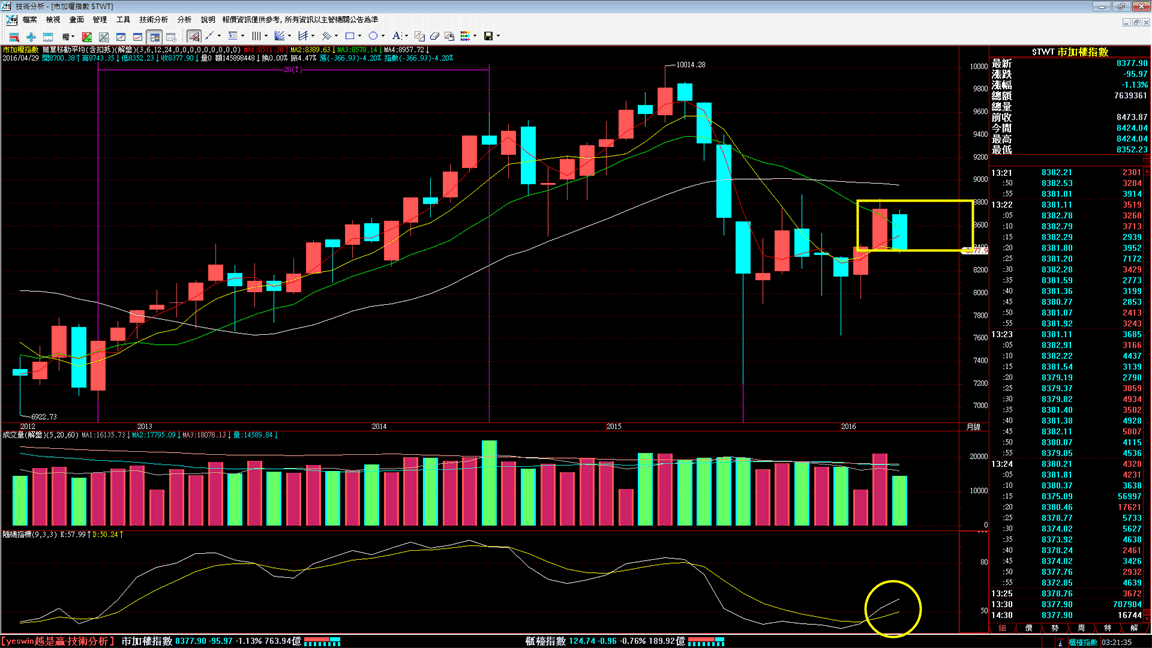 4/29月線收盤還是月K值>月D值。計算了一下,台股五月月KD死叉條件,也就是加權指數跌破8051,才會出現月KD死叉。提供大家參考一下。