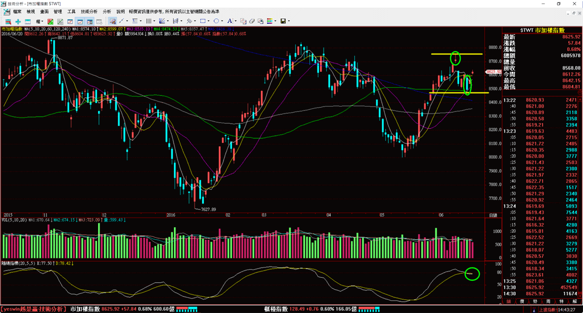 指數在6/8的上影線和6/16的中黑K包覆住的區間裡面進行震盪