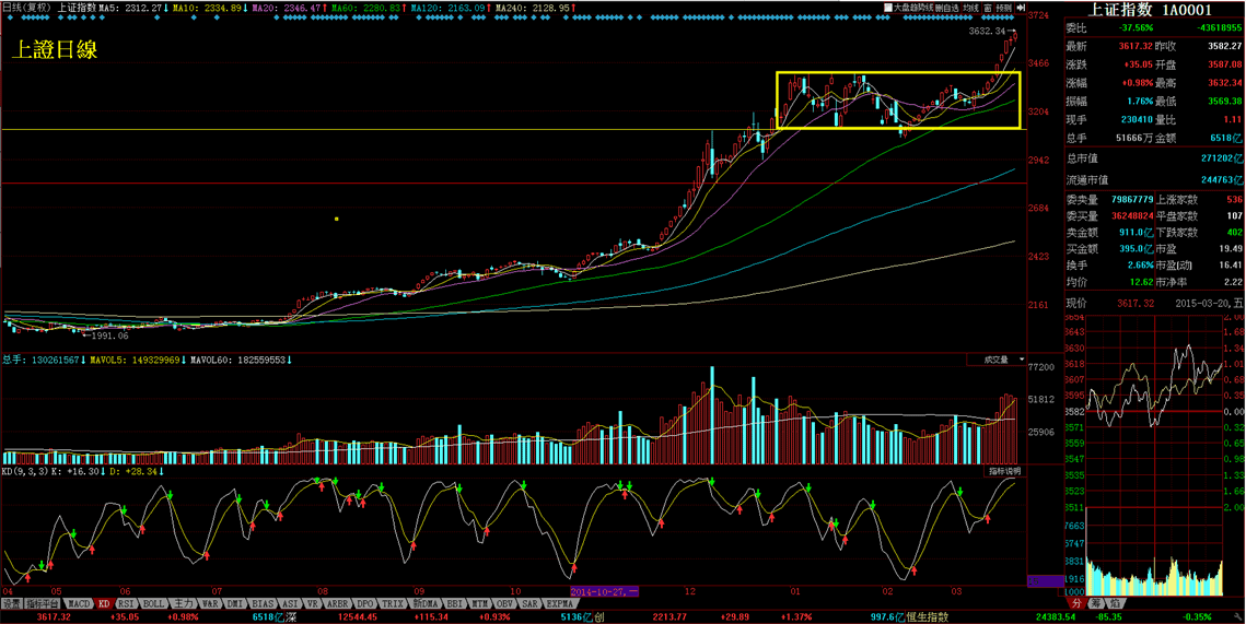 3/16上證指數又突破了1月底的波段高點3406點續創波段新高
