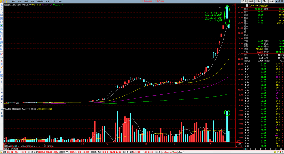 指標股中國南、北車的狂飆之旅也在昨天拉出一根爆大量的「空方試探」黑K之後結束了狂牛之旅
